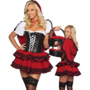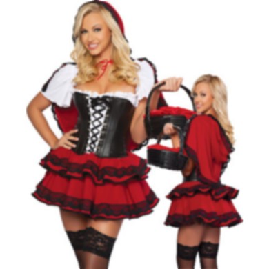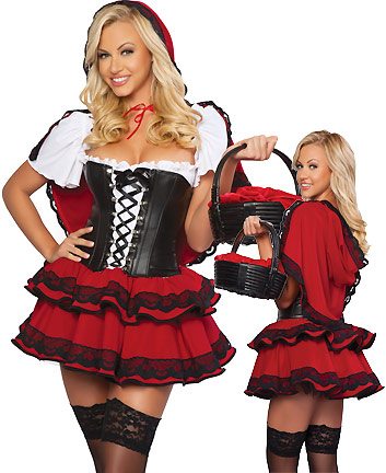 Three Piece Wolf Bait Costume includes Lace Trim Hooded Cape, Peasant Style Double Layered Lace Trim Dress, and Satin Ribbon Lace Up Waist CincherAdditional Information