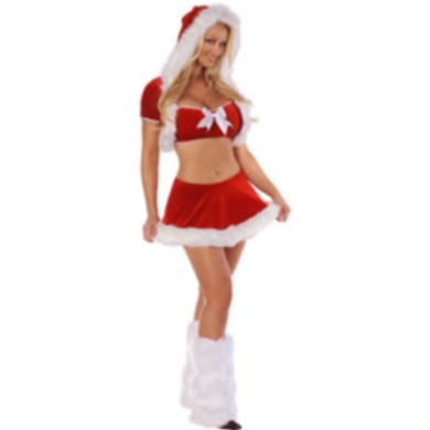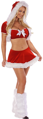 Flirty Santa skirt set includes top tube with Satin bow and built-in fur trimmed hooded jacket and fur trimmed skirt and sexy fur boot cover.Additional Information
